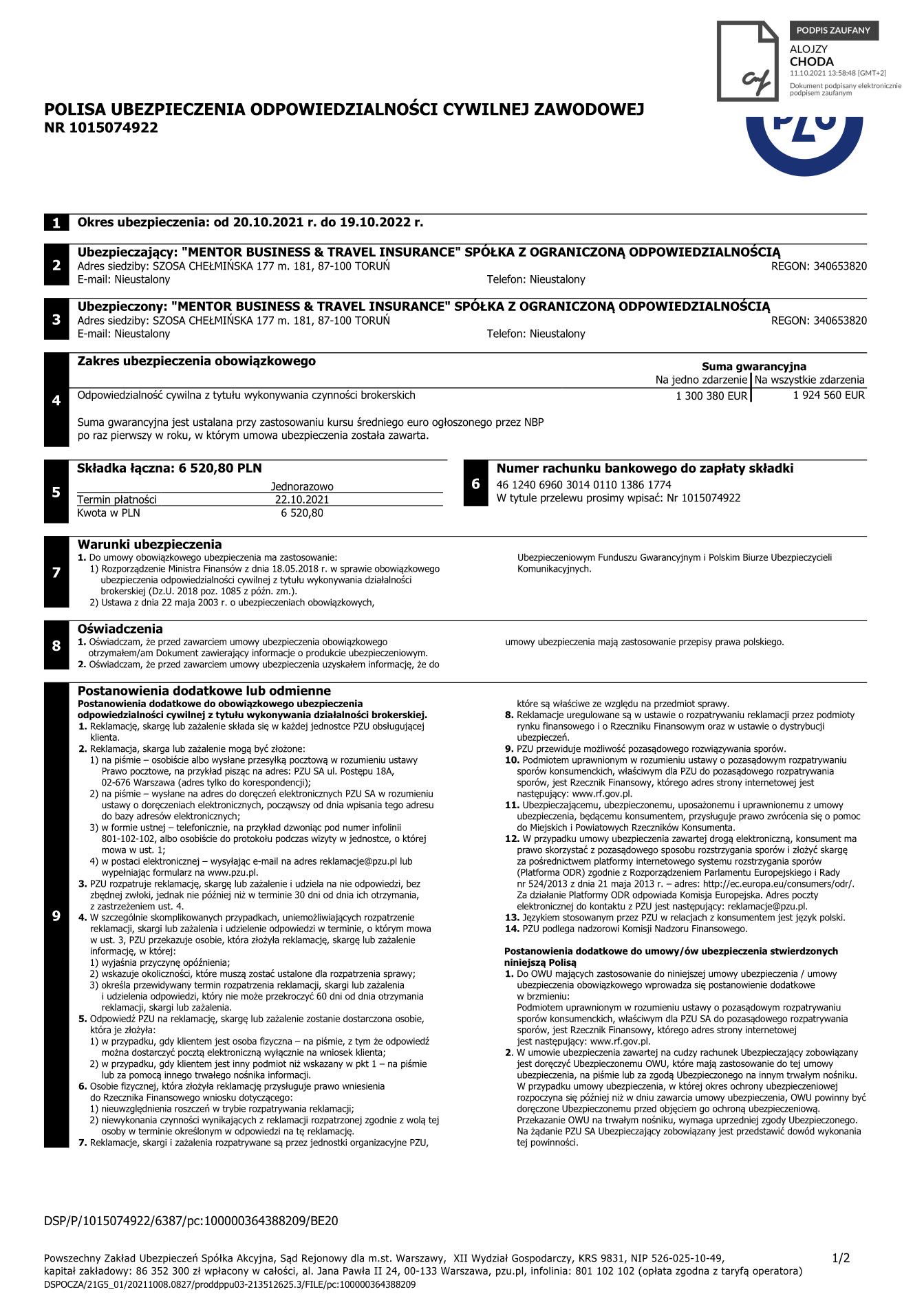 Posiadamy polisą OC brokera na sumą gwarancyjną na wszystkie zdarzenia o wartości 1 924 560 EUR lub na jedno zdarzenie 1 300 380 EUR